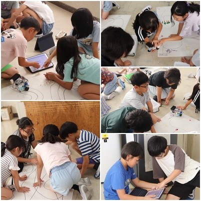 スクラッチでプログラムを作り、自分達で決めたコース(線)の上を走らせます。前に進んでから後ろに戻る命令を組み込んだり、秒数を測って動く時間を決めたり、試行錯誤しながら調整をしていました。思いのままに動かすのは大変ですが、上手くいったときには嬉しそうでした。