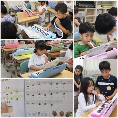 ド・レ・ミだけを使っている曲「どんぐり ころりん」を鍵盤ハーモニカで演奏しました。息を吹く強さや指の運びに気をつけて弾きます。列ごとに演奏したり、リレー形式で一人ずつつないだりして演奏していました。