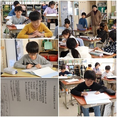 「わたしと小鳥と鈴と」や「夕日がせなかをおしてくる」など詩の音読を行っていました。繰り返し行うことで、暗記している人もいました。みんなちがってみんないい、元気がでるなど感想も伝えました。