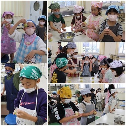 世話をして育てたサツマイモの収穫し、そのサツマイモで茶きんしぼりを作りました。ラップでぎゅっとにぎるとほどよい形になりました。品種によっては、ほくほくだったり、色が黄色っぽかったりと違っていますが、その違いも楽しみながらいただきました。昨日は3組。今日は1組。明日は2組です。
