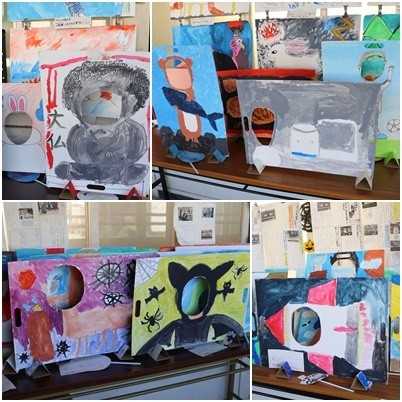 くり抜いた穴から顔を出すと、色々なものに変身できます。思い思いの世界が描かれていて、どの作品も素敵です。