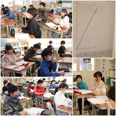 変わり方を調べたり、グラフを書いたりして、比例とは何かを調べます。途中で何回も「比例とは?」と聞かれ、皆が説明できるようになっていきました。