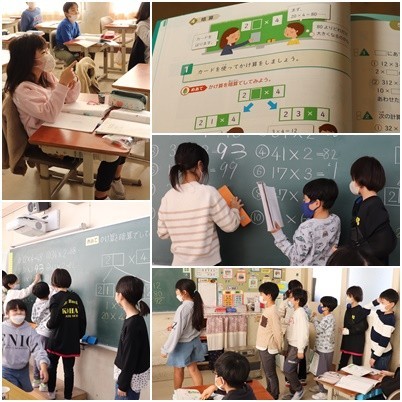 1の位のかけ算、10の位のかけ算、合わせていくつの手順で、2けた×1けたのかけ算を暗算で解きました。皆の前で発表も楽しそうでした。