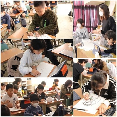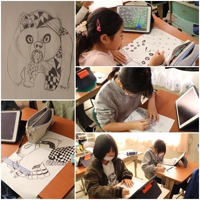 4年生の版画のテーマは「動物」。何にしようか考えた後は、幾何学模様を入れて、デザインを考えます。終わりのチャイムが鳴っても、集中して取り組んでいました。