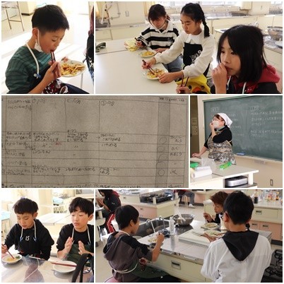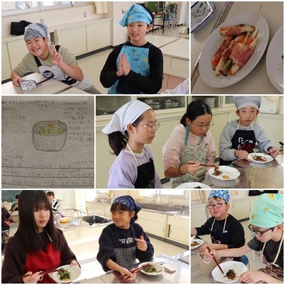 グループごとに、献立を考え、計画を立てて調理実習にのぞみました。ポテトサラダに、じゃがコーン、野菜炒めに、ベーコン巻き、どのメニューも、おいしそうでした。それぞれの班の隠し味を説明してくれました。
