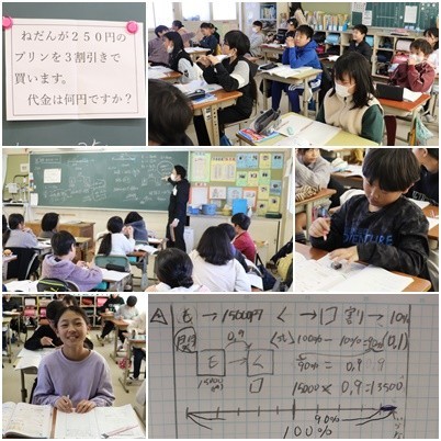 割合の学習です。何割引き、何パーセント引きに関する問題です。「店員さんに言われただけお金をだしていると、もしかすると損をしてしまうかも?」と言われると、真剣なまなざしになりました。だいたいで計算して、買い物ができるとよいですね。