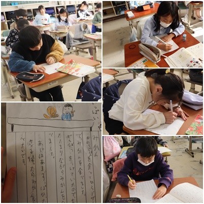 みかんや雪だるま、雪合戦、さざんかなど、冬への思いを文に表します。今までのことを思いだしながら書いていると、楽しくなってきますね。