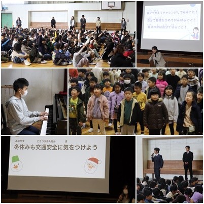 様々な行事があった2学期。一生懸命がんばったことや友達と協力したこと、喧嘩したことや失敗したことなど、いろいろな経験が成長につながったと思います。終業式では、自分を振り返り、自分を高めること、自分で決めてやってみること、「自分」を意識して、冬休みを過ごしてほしいことを伝えました。