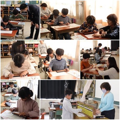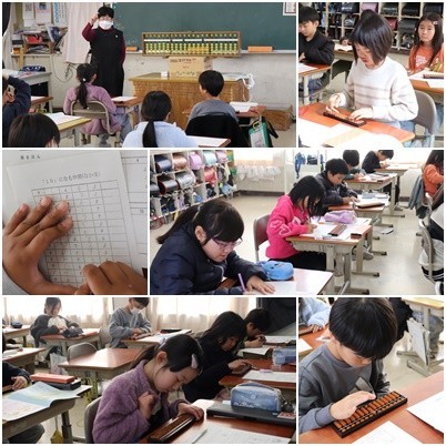 講師の先生に来ていただき、そろばん教室を行いました。まずは、そろばんの仕組みや指のつかいかたなど基本的なことから教えていただきました。「ねがいましては…」と始まると、読み上げられる数字を集中して聞いていました。