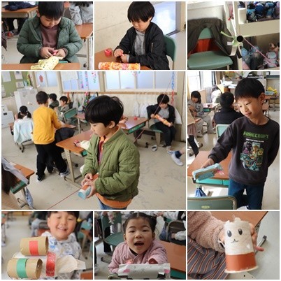 教室の高いところにはった紐にクリップの部分を通し、それぞれの作品を滑らせます。ちょうど終わって片付けるところでしたので、風を切って滑降するところが見れなくて残念でした。満足そうな子どもたちの様子から楽しかったことが伺えました。