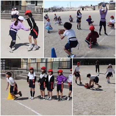 ラグビーボールを上からや下から投げて送る競争をしたり、真ん中や他のチームの陣地にあるボールを取りに行ったり、タグを取り合ったり、様々なゲームを行いました。試しのゲームをしてみると、どうすると勝てるのか、相談が始まりました。