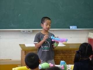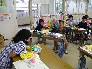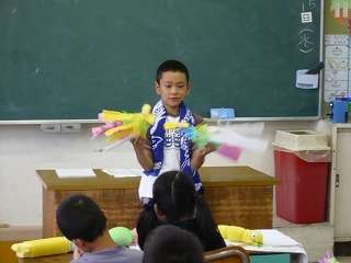 2年2組。図画工作の「これ いいかんじ」というスポンジやモールを使っての工作です。出来上がったので、作品発表会をしました。「気に入っているところはどこですか。」「はねのところが気に入っています。」「どうしてリボンをつけたんですか。」「かわいいからです。」「カメレオンは好きですか。」「はい好きです。」