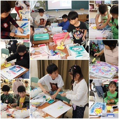 スタンプのようにぺったん、自分で模様を描いたローラーをコロコロ。好きな色をつけて、重ねていくと画用紙いっぱいに素敵な作品ができてきました。
