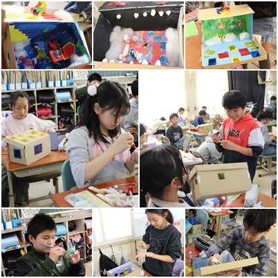 箱の中に、楽しい世界を作っていました。雪のお城の中だったり、ドールハウスのようだったり、海の中、宇宙、森の中、竜宮城、お化け屋敷、パーティーの途中など思い思いの世界が広がっています。まるで玉手箱のようです。
