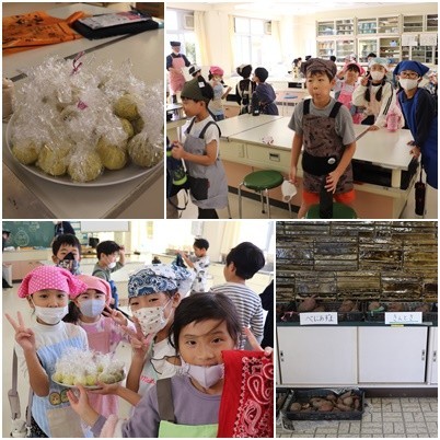 世話をして育てたサツマイモの収穫し、そのサツマイモで茶きんしぼりを作りました。ラップでぎゅっとにぎるとほどよい形になりました。品種によっては、ほくほくだったり、色が黄色っぽかったりと違っていますが、その違いも楽しみながらいただきました。昨日は3組。今日は1組。明日は2組です。