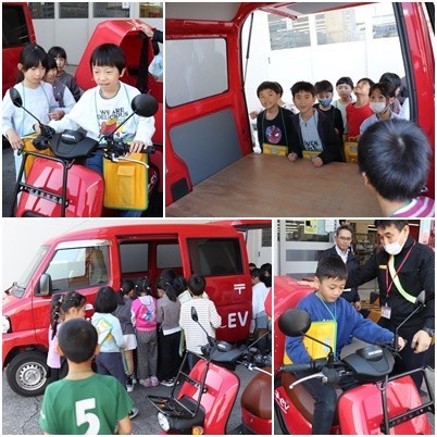 郵便局に見学に行きました。配達のバイクや車、ポストの中などいつも見ることができないところも見せていただきました。目を輝かせて見学し、たくさんメモをしていました。