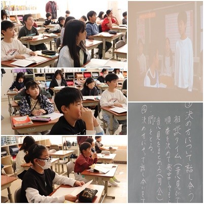 話し合いの進め方の動画を見て、流れをつかみました。何をどんな順で話すとよいか集中して聞いていました。次は、自分たちの番です。メモしたことをもとに練習が始まります。