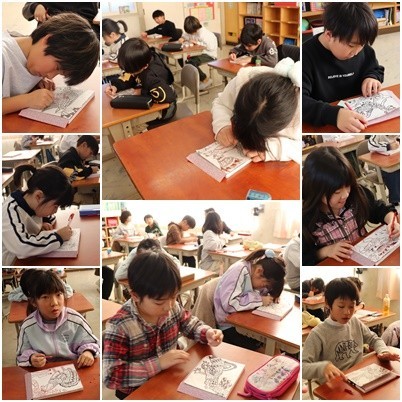複雑な下絵を石膏板に写していました。3年生にとっては、最後の石膏版画です。複雑な羽の模様や細かい毛並みなど、目を引く素敵な下絵ばかりでした。彫るのも大変根気のいる作業だと思いますが、がんばってほしいと思います。
