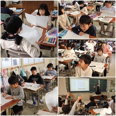 「おとのはなびら」の詩をどのように音読をするとよいのかについて皆で考えました。「ポロン」は弾むようにとか、2回でてくるから2回目は…など様々な意見が出てきました。皆で話し合ううちに、頭の中に様子が思い浮かんできたようです。