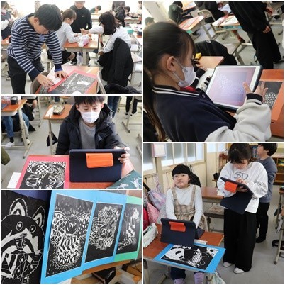 完成した版画作品を掲示用に、色画用紙に貼り、名札をつけます。タブレット端末で写真を撮って、感想を書き、送ります。終わると次の課題のアイデアスケッチとそれぞれに手際よく進めていました。