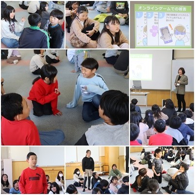 講師の先生に来ていただき、スマホ教室を行いました。「この後、何が起きるでしょうか」「どうすればよかったでしょうか」という問いに、子どもたちの様々な意見が出ました。「しっかりした4年生ですね」「休み時間とのメリハリにも感心しました」とお褒めの言葉をいただきました。