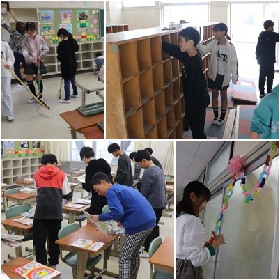 1年間使った机やロッカーなどをきれいにしました。机の上の名前シールをはがしたり、机の中までぞうきんがけしたり、いつもは手の届かないところまで掃除しました。新1年生も気持ちよく使えますね。