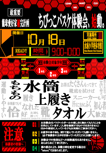 水南TOPS ちびっこバスケ体験会のお知らせ 公開日 2025/10/17 更新日 2025/10/17 水南HP 1年生から3年生の子を対象に、バスケ体験会をやります。ぜひ、体育館へ遊びに来てください。詳細は、10/8tetoru配信の添付資料をご覧ください。たくさんのご参加をお待ちしています。 いいね(0)