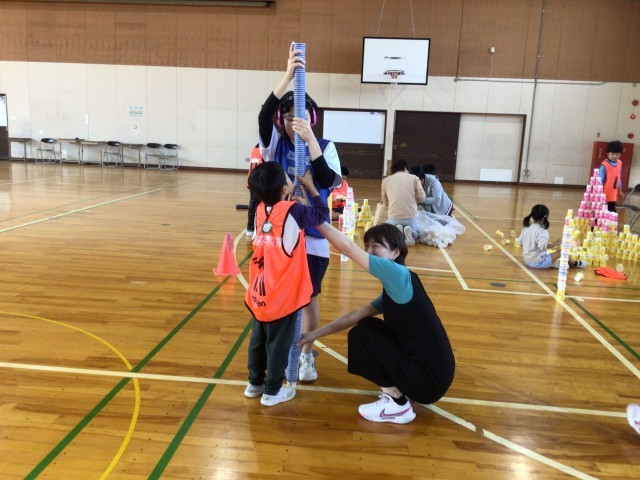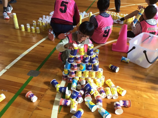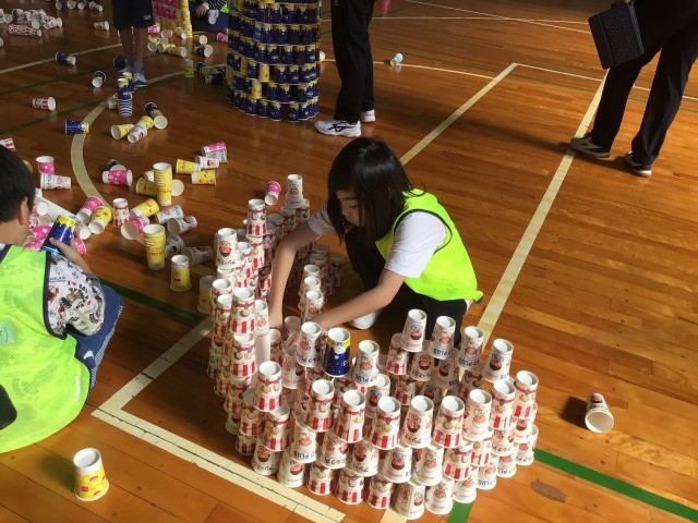 最後は、カップつみで盛り上がりました。朝は「どんなことがあるかな?」とわくわく・ドキドキしていましたが、中学生のお兄さん・お姉さんや他の学校の友達と関わる中で、たくさんの笑顔が見られました。