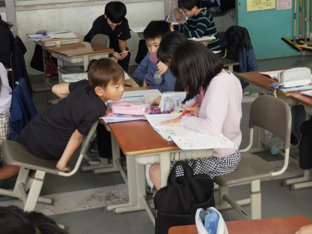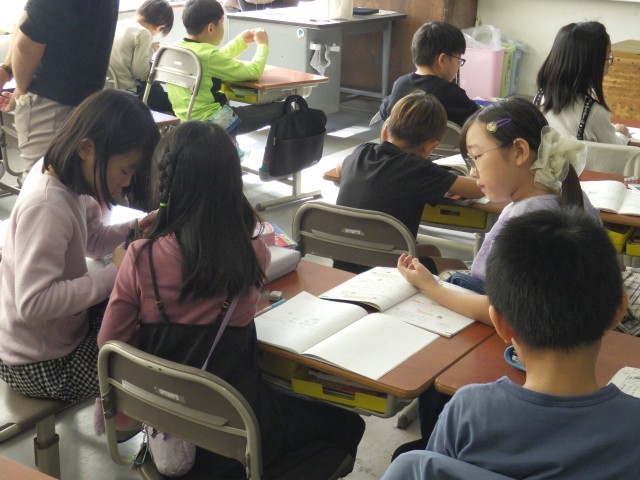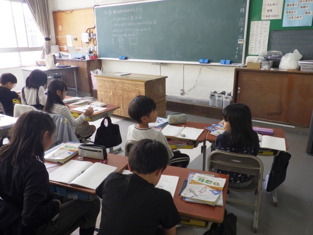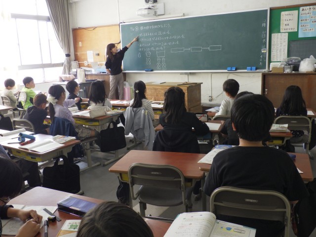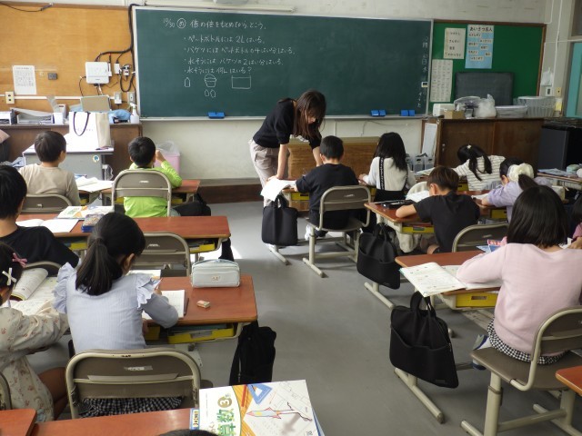 「何倍でしょう」の単元では、数量の倍関係を図に表しながら理解し、それを式にして答えを導いていきます。この時間は、ペットボトル、バケツ、水槽と違う入れ物に入る水の量の関係を基に考えました。
