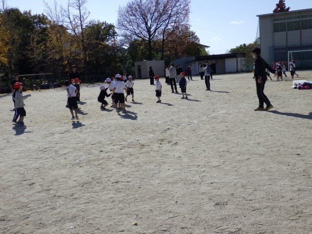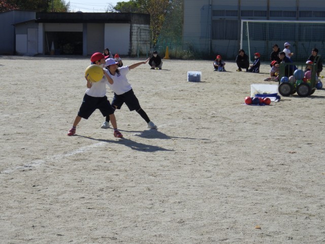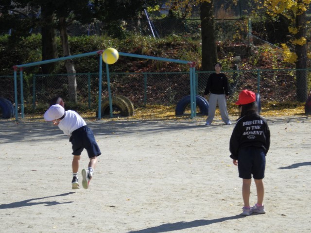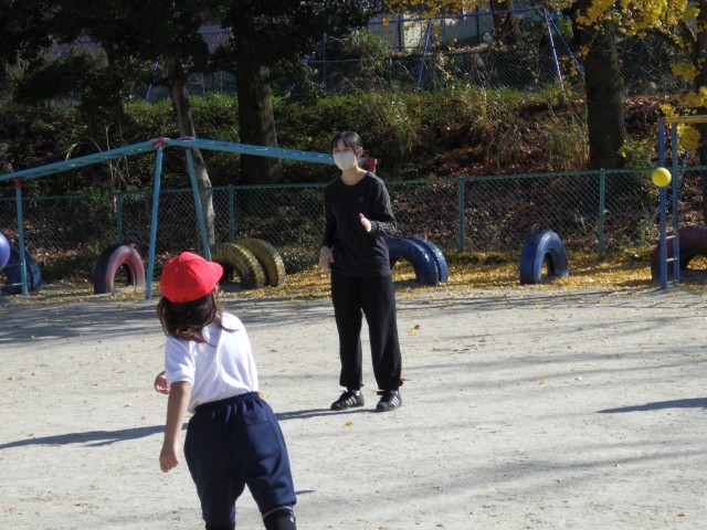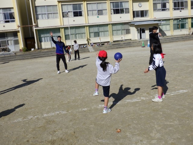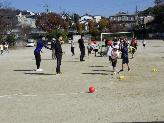 中京大学のお兄さん、お姉さんと行う体育の授業3回目です。とりあえず今回で一区切りとなります。多くのお兄さん、お姉さんの励ましの声、丁寧な指導に、子どもたちはますます上手にボールを投げられるようになりました。勢いよく投げたり、遠くまで投げたりすることができる子が増えてきました。こうして自信を付け、運動に親しもうとする子がもっと増えていくといいなと思います。