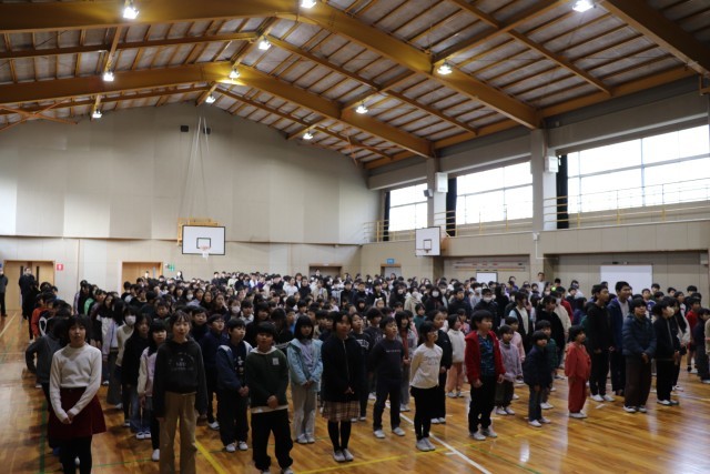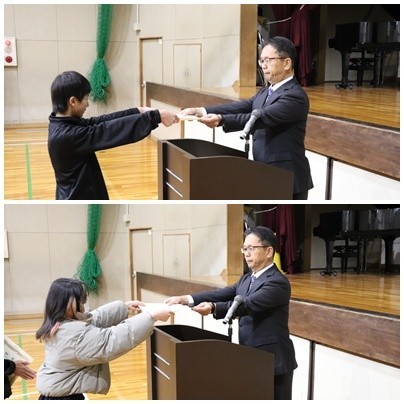 皆で気持ちをつくって式に臨むことができました。式では、「一生懸命に練習をし続けた運動会での取り組みを基に、頑張り続ける姿勢は人の心に届き、人を励ますもので、そのことがすでにすばらしいことです」と話がありました。新しい年も、いろいろな場面で頑張り続ける姿がたくさん見られるといいなと思います。冬休み、健康と安全に気をつけて過ごしてください。そして、三学期も元気な姿で会いましょう。