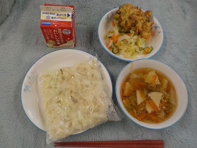 今日のメニューは、きしめん、大豆とごぼうのかき揚げ、たくあんあえ、牛乳。