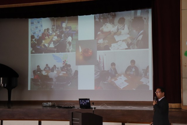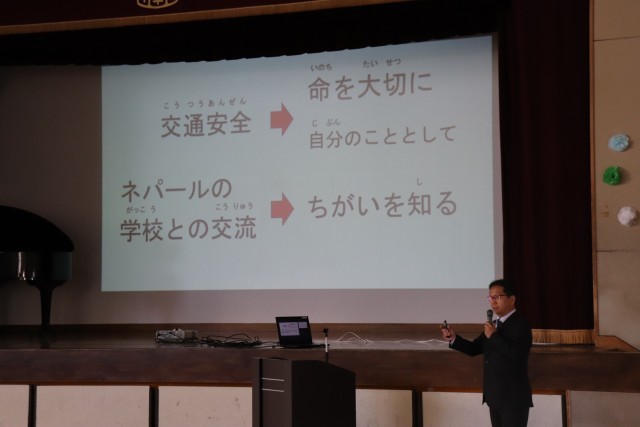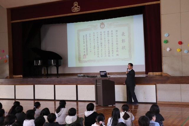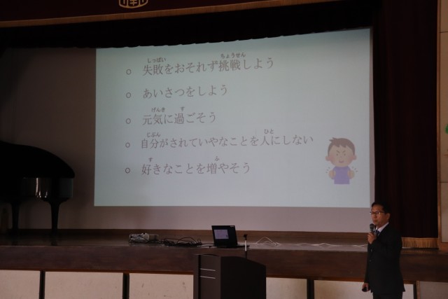 その後、本校が交通安全の取り組みにて表彰されたことと、5年生が国際交流を行った際の話がありました。