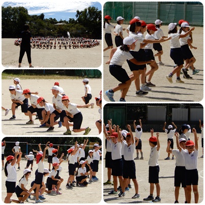 3・4年生の体育です。運動会のダンスの練習を運動場で行いました。最後の隊形移動まで進んでいます。