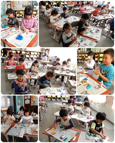 クルクルまわして 公開日 2019/11/07 更新日 2019/11/07 水南HP 1年生の図工です。風でクルクル回る形を、キラキラ光るおりがみをはりつけていました。出来上がってクルクル回るのが楽しみです。 いいね(0)