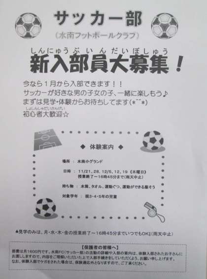 サッカー部 部員募集です! 公開日 2019/11/10 更新日 2019/11/10 水南HP サッカー部(水南FC)は、新入部員を募集しています。初心者大歓迎です。3〜5年生のみなさん、ぜひ、体験してみてください。 11月21日・28日・12月5日・12日・19日(いずれも木曜日)の授業後お待ちしています。 いいね(0)