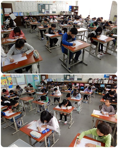 4年生が国語の漢字テストをしていました。皆よく勉強がしてあるようで、真剣に取り組んでいました。