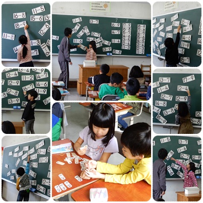 1年生の算数です。計算すると同じ答えになるカードを見つけていました。
