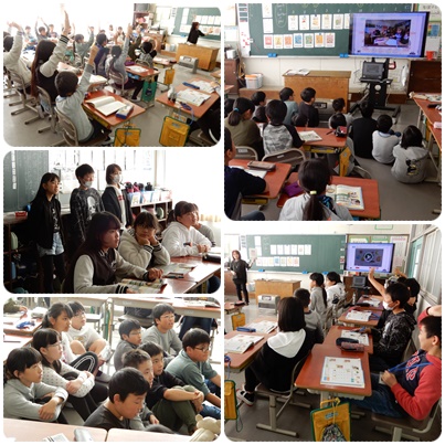 5年生の外国語活動です。各教科の英語での言い方を学んだり、外国の学校事情を映像と英語による解説で知ったりしていました。