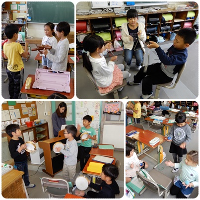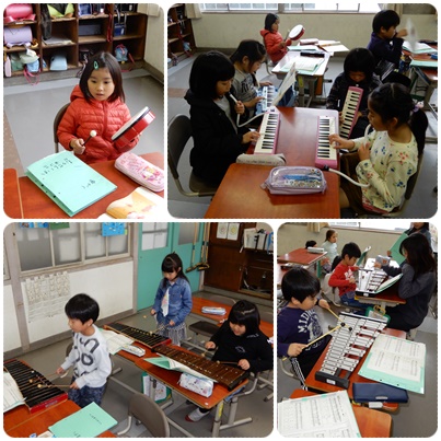 2年生の音楽です。タンバリン、カスタネット、木琴、鍵盤ハーモニカなど、自分で選んだ楽器で、「手のひらをたいように」の合奏に向けて楽器ごとに楽しそうに練習に取り組んでいました。