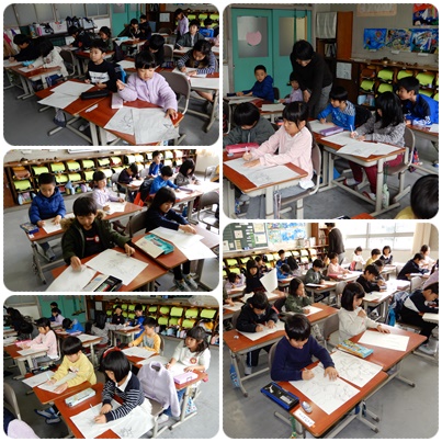 担任の先生に龍の話の本を読んでもらいました。想像の世界はどんどん広がります。空に昇る勇ましい龍を描きました。
