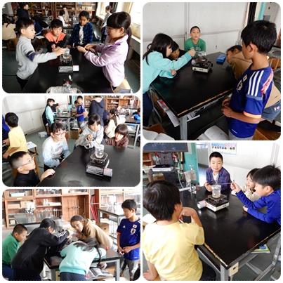 金属のスプーンを湯気に近づけたり、ビーカーの中の様子を観察したりしました。