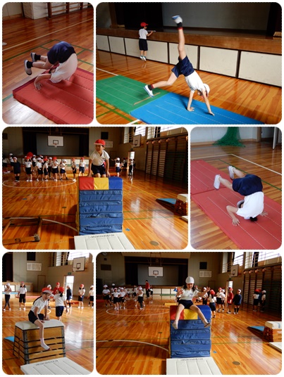 とっても身軽です 公開日 2019/12/13 更新日 2019/12/13 水南HP 2年生の体育です。2つのクラスが体育館で、マット遊び(運動)・跳び箱遊び(運動)をしていました。 マットは、前回り、後ろ回り、側転など自分の技量にあわせて取り組んでいました。 跳び箱は、やがて跳べるようになるための練習です。乗ったり、またいだり、座ったりしながら、跳び箱に慣れていきます。 いいね(0)