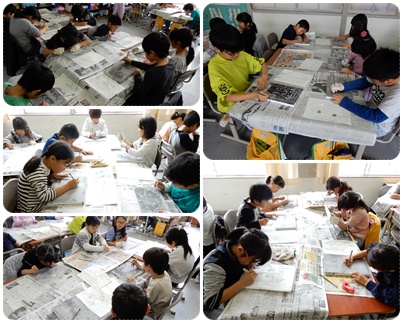 3年生の図工です。石こう版画で鬼を彫っていました。こわい鬼にしようと彫り方を考えていました。