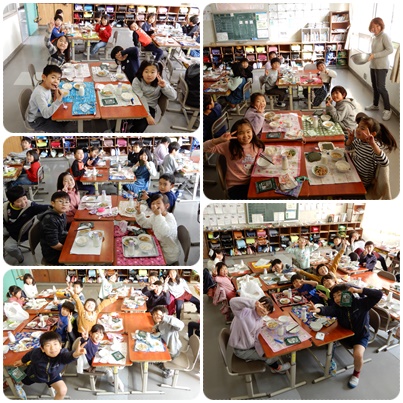 のりでご飯とツナとはりはりづけをいっぱい巻いて楽しそうに食べていました。男子も女子もおかわりをいっぱいしていました。