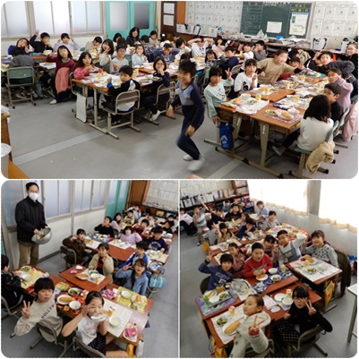 3年生の給食の様子です。今日のメニューは、鳥肉のクリーム煮、ブロッコリーのサラダ、ロールパン、発酵乳です。