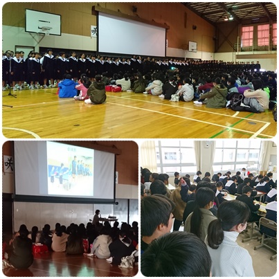 小学校の倍の大きさの体育館では、始めに中学1年生の合唱を聴かせていただきました。300人以上の合唱は声に厚みがあり、声が押し寄せてくるようでとても素敵でした。