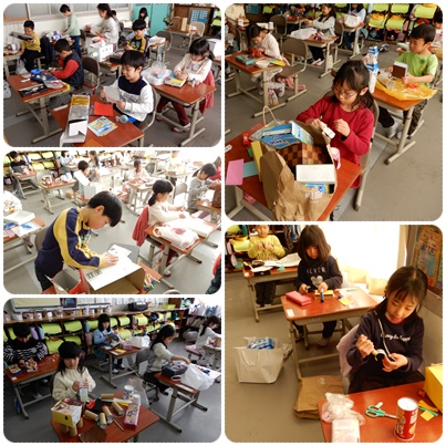 1年生の図工です。家から持ってきた空き箱やロールペーパーの芯、小さなかざりから様々なものを想像して立体感のあるものを作ります。