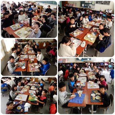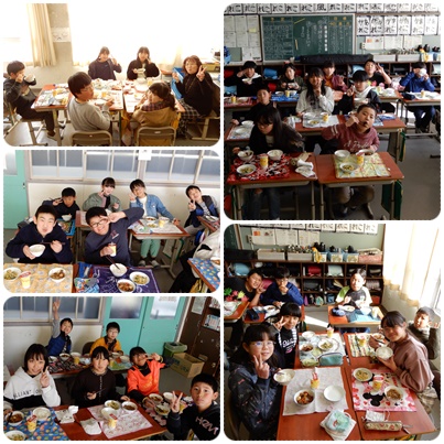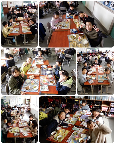 5年生の給食の様子です。今日の献立は、鉄火みそ(うずら卵入り)、アーモンドあえ、ごはん、発酵乳です。