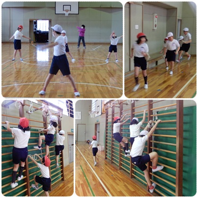 わかば組の体育です。毎朝、基本の運動をくり返し行って、基礎体力をつけています。